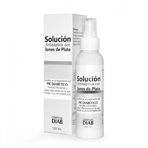 CERTUS DIAB AG® solución antiséptica con iones de plata está especialmente formulada para el tratamiento del pie diabético, heridas infectadas, quemaduras de segundo y tercer grado, áscaras (úlceras por presión) y úlceras varicosas. Formulada con IONES DE PLATA los cuales tienen propiedades regenerativas y cicatrizantes. No contiene fragancias y es libre de parabenos. Su ingrediente activo entre en la piel, fomentando la regeneración celular previniendo infecciones causadas por virus, bacterias y hongos.
